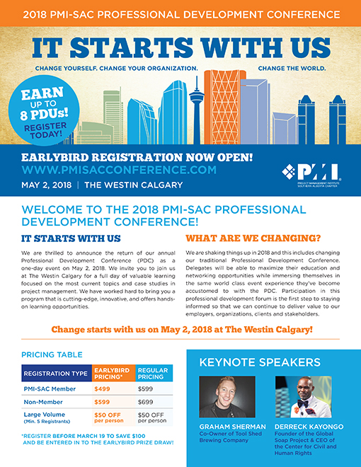 The Project Management Institute Southern Alberta Chapter (PMI-SAC) will host their popular Professional Development Conference (PDC) as a one-day event on May 2, 2018. We invite you to join us at The Westin Calgary for a full day of valuable learning focused on the most current topics and innovative case studies in project management.